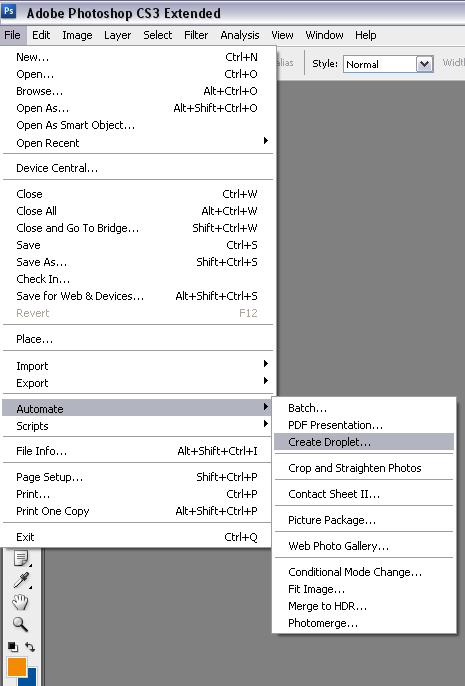 Creating a Droplet is very similar to creating a Batch job. Click File > Automate > Create Droplet from the menu.