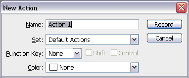 When you create a new Action, a dialog box will appear. You can choose where to save your action, what to name it (use a descriptive name) and what key or key combination to assign to the Action. Click Record when you’re ready to begin recording your new Action.