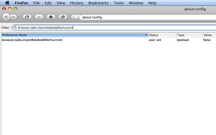Once you have found the browser.tabs.insertRelatedAfterCurrent preference, you’ll notice that the default value is true. Right-click on the preference name and choose Toggle (or just double-click the preference name to toggle automatically). This will change the value to false.